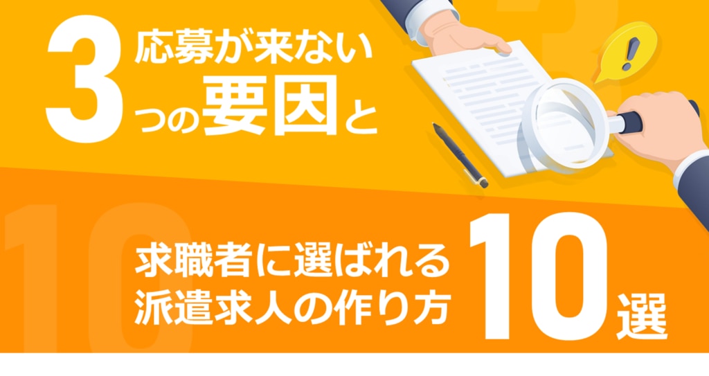 「派遣スタッフの求人を出しても、応募が集まらない…」という悩みを抱える派遣会社は多いでしょう。応募数を増やすためには、応募が来ない原因と改善策を把握することが重要です。本資料では、応募が来ない3つの原因と、求職者に選ばれる派遣求人10選を紹介します。
