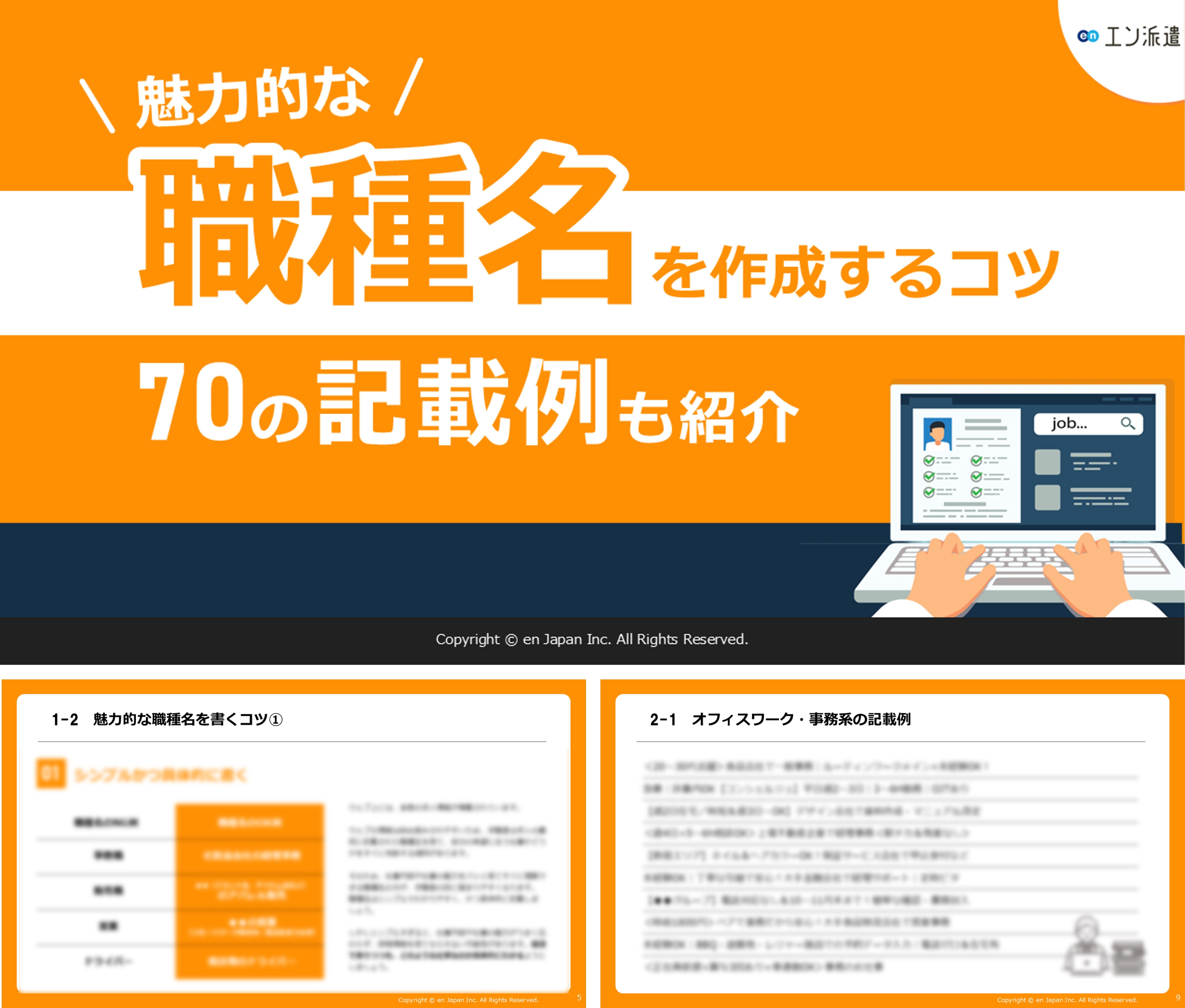 本資料では、派遣求人において魅力的な職種名を作成するコツについて詳しく解説します。求人で職種名が重要な理由から魅力的な職種名を作成するコツ、魅力的な職種名の記載例まで、わかりやすく解説しますので、ぜひ職種名の作成にお役立てください。